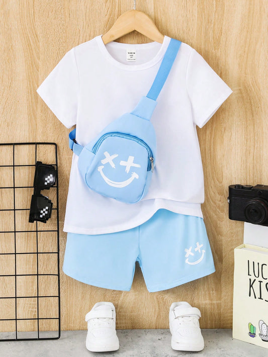 Niñito Camiseta unicolor & Shorts con estampado de dibujos animados & Accesorio Bolso