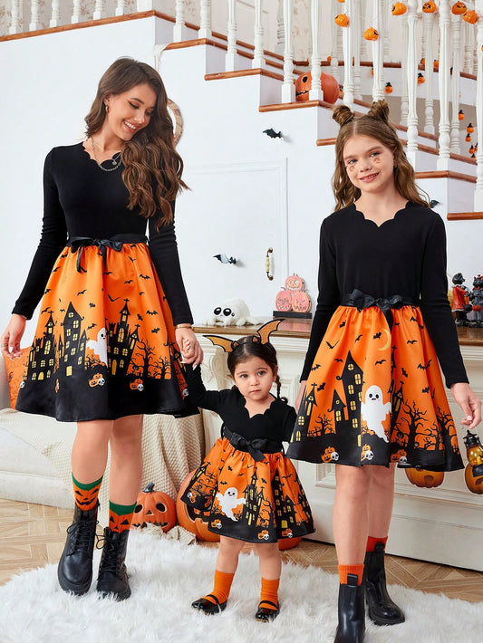 Vestido de manga larga con estampado de dibujos animados lindo y parche para la cintura para niña bebé en otoño para Halloween