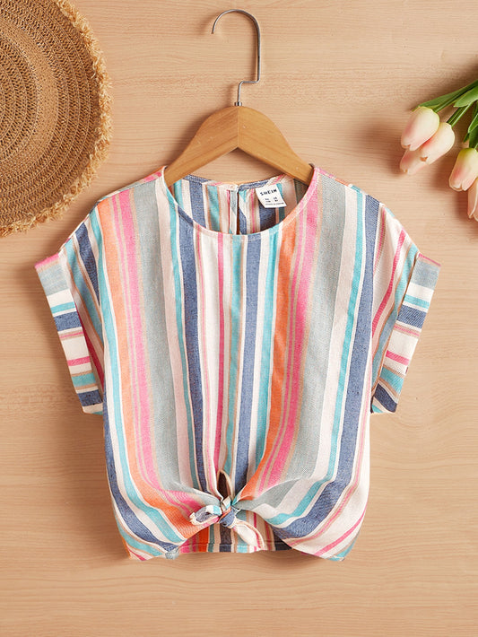 Chicas Blusa con estampado de rayas bajo con nudo de manga murciélago