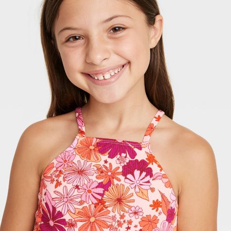 Traje de baño de 2 piezas de niña con camisa de flores y panty unicolor