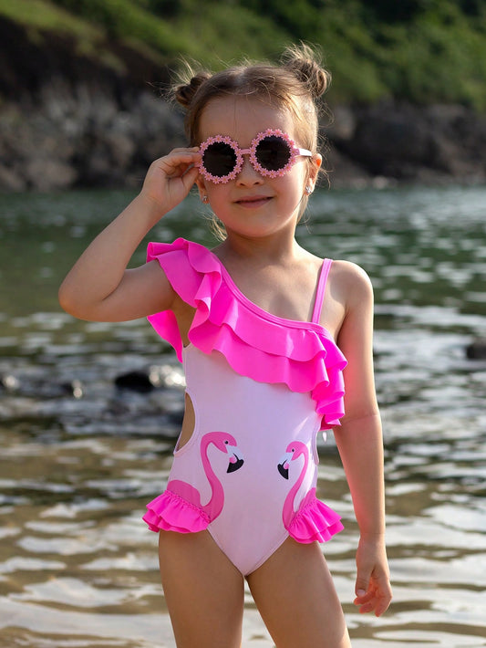Traje De Baño De Una Pieza Para Niña Con Impresión De Flamenco Y Volantes De Bloques De Colores Con Cubierta De Juego