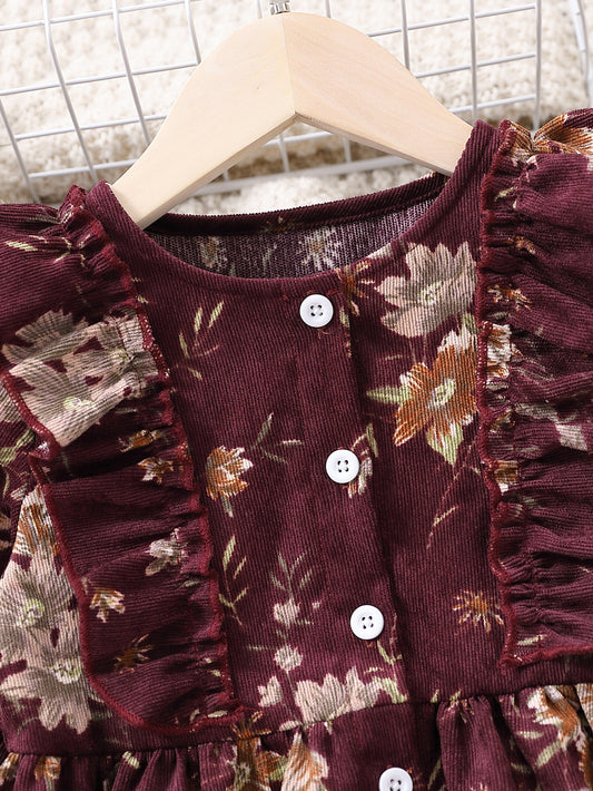 Niñitas Vestido con estampado floral de manga con volante ribete con fruncido de pana