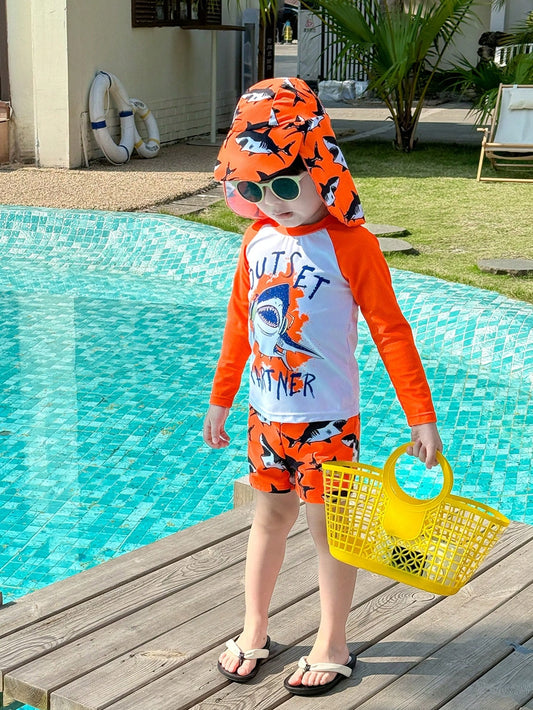 Conjunto de 3 piezas para niño pequeño con protección tipo rash guard con estampado de tiburón